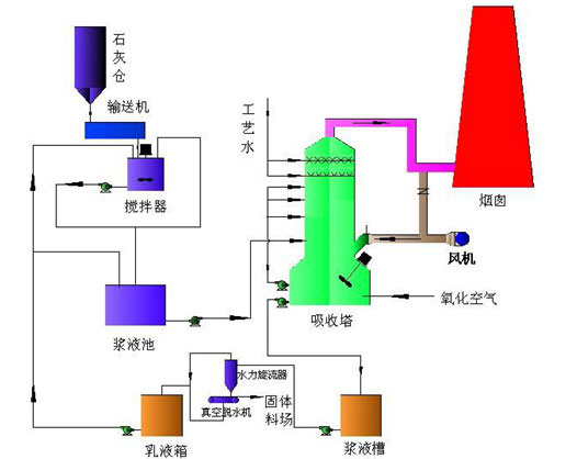 采用石灰石或石灰作為脫硫吸收劑,石灰石經(jīng)破碎磨細(xì)成粉狀與水混合攪拌成吸收漿液,當(dāng)采用石灰為吸收劑時(shí),石灰粉經(jīng)消化處理后加水制成吸收劑漿液。在吸收塔內(nèi),吸收漿液與煙氣觸混合,煙氣中的二氧化硫與漿液中的碳酸鈣以及鼓入的氧化空氣進(jìn)行化學(xué)反應(yīng)從而被脫除,終反應(yīng)產(chǎn)物為石膏。